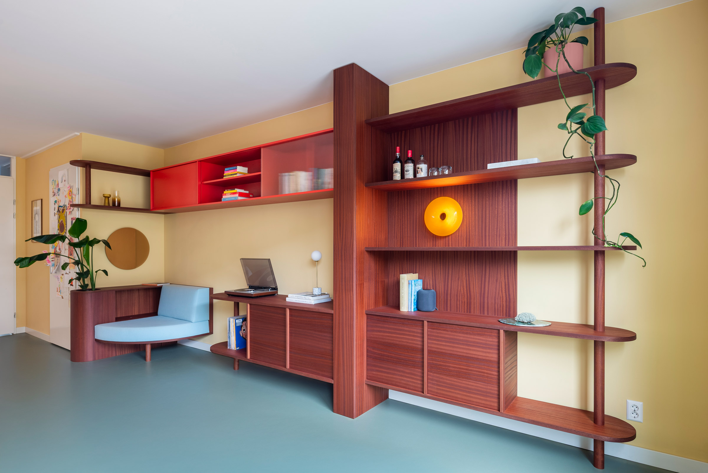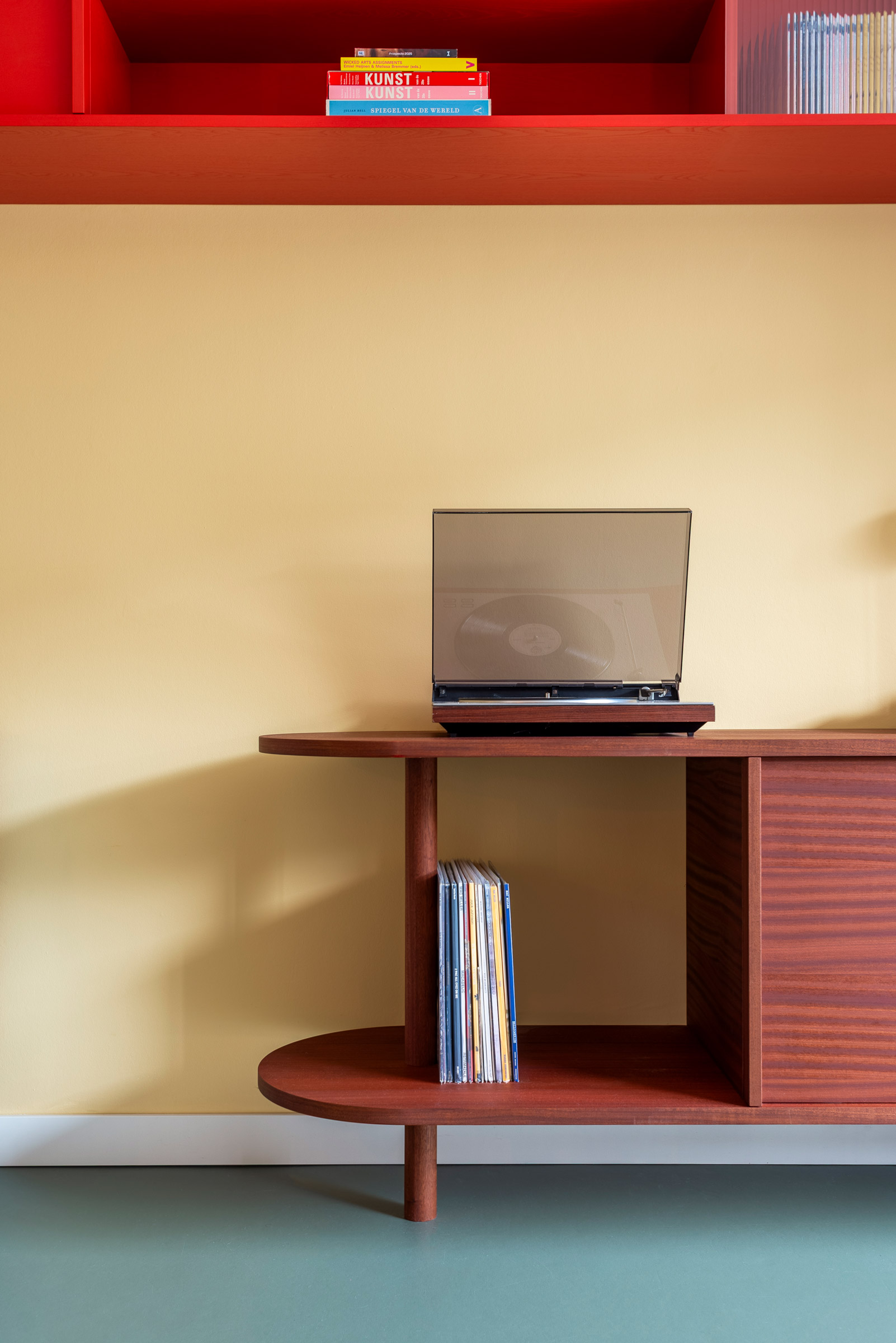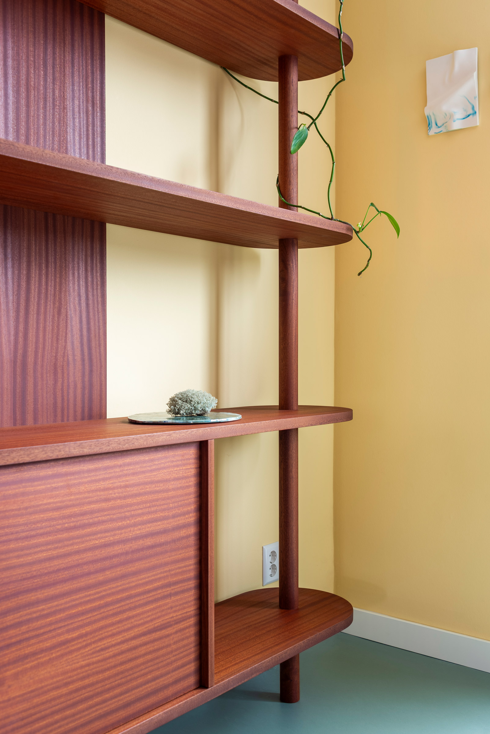 De kamerhoge smalle kolom werd het ijkpunt in het ontwerp, in het midden van de zes meter lange wand. Hierin zijn onder andere elektra en kabels verwerkt, die door kabelgootjes naar de kasten aan weerskanten doorlopen.