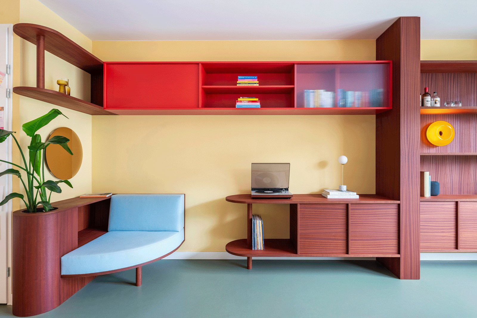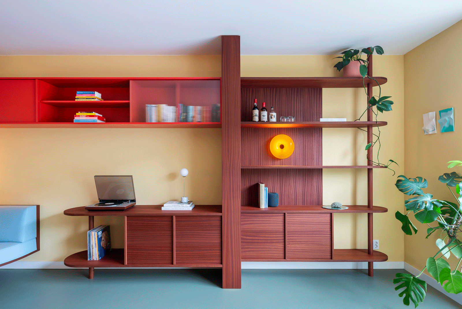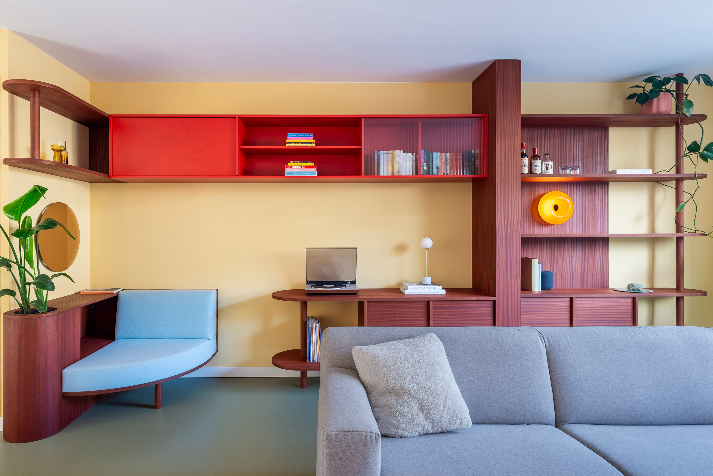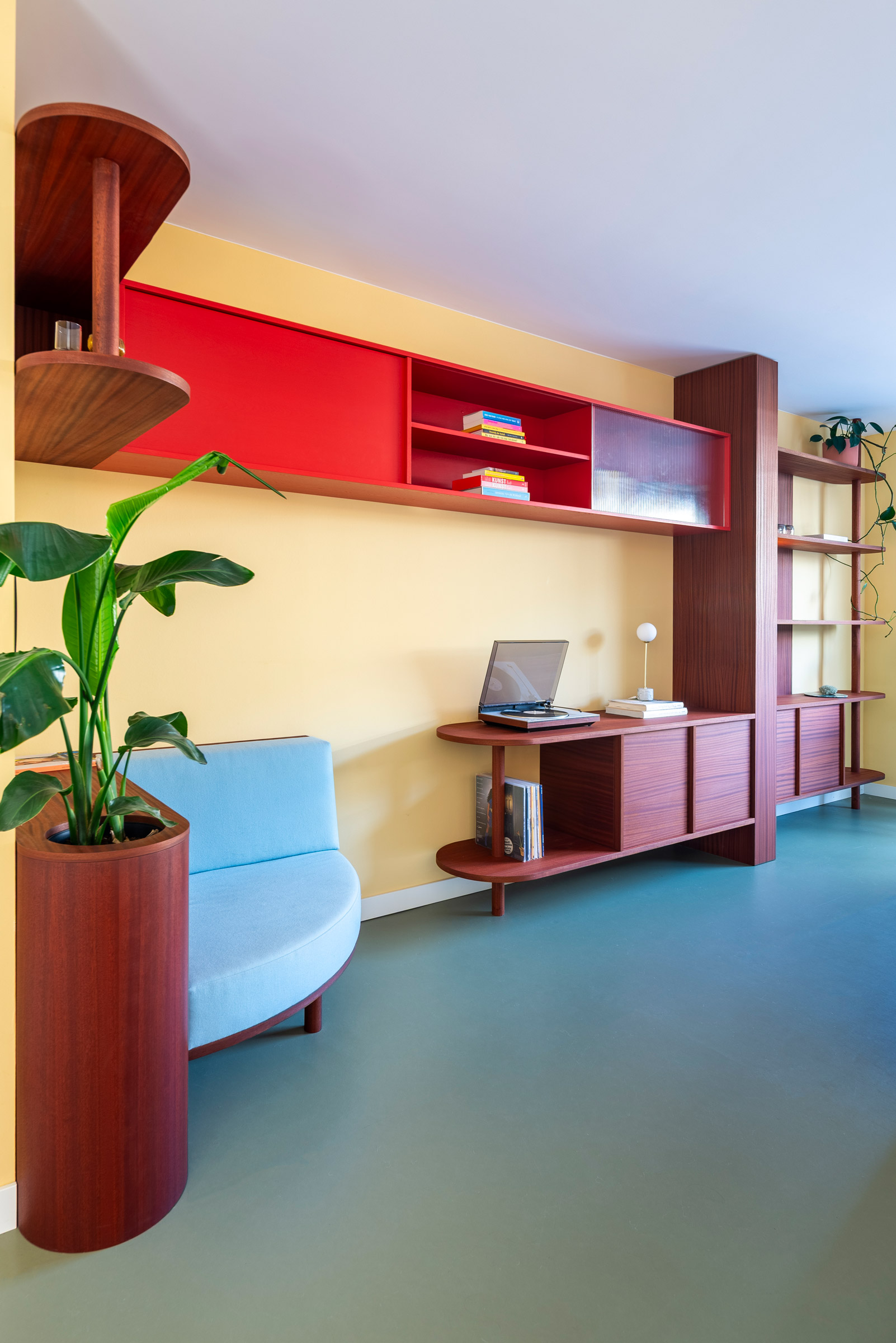De kamerhoge smalle kolom werd het ijkpunt in het ontwerp, in het midden van de zes meter lange wand. Hierin zijn onder andere elektra en kabels verwerkt, die door kabelgootjes naar de kasten aan weerskanten doorlopen.