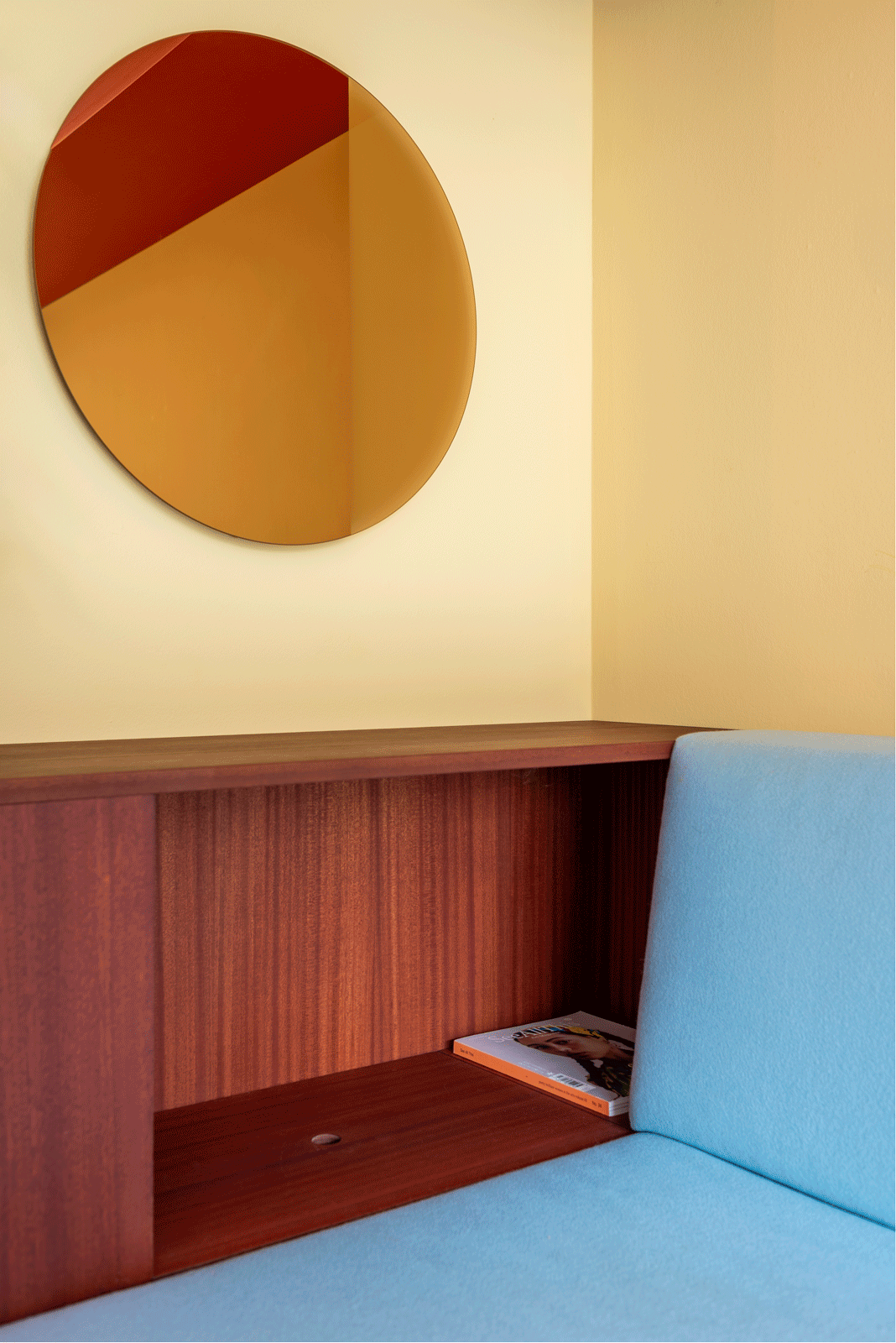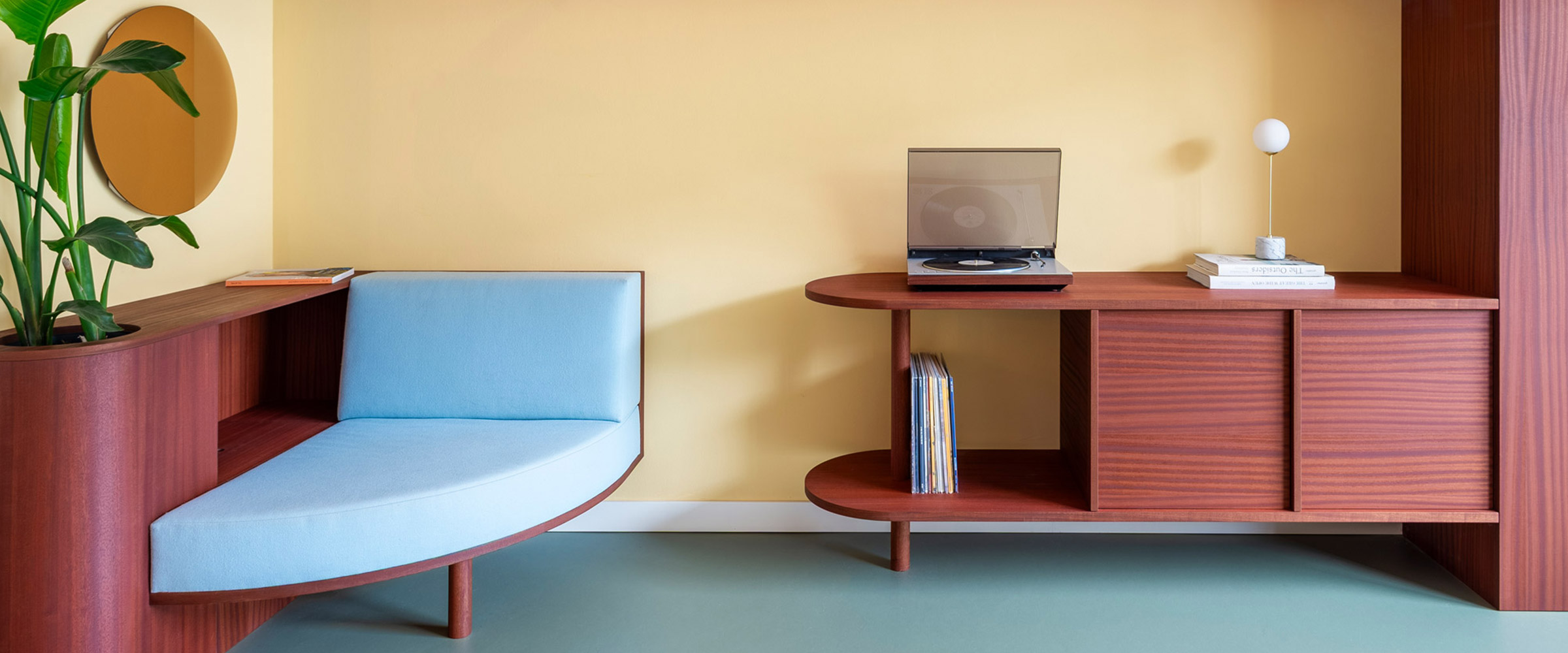 In hun nieuwbouwwoning in Bergschenhoek ontstond bij Michelle en Nick behoefte aan wat meer karakter in de woonkamer. Het werd een speels en ruimtelijk ontwerp met diepteverschillen en ronde vormen. De combinatie van mahoniehout en een warme én koele kleur werkten goed samen met de lichtgele achterwand.