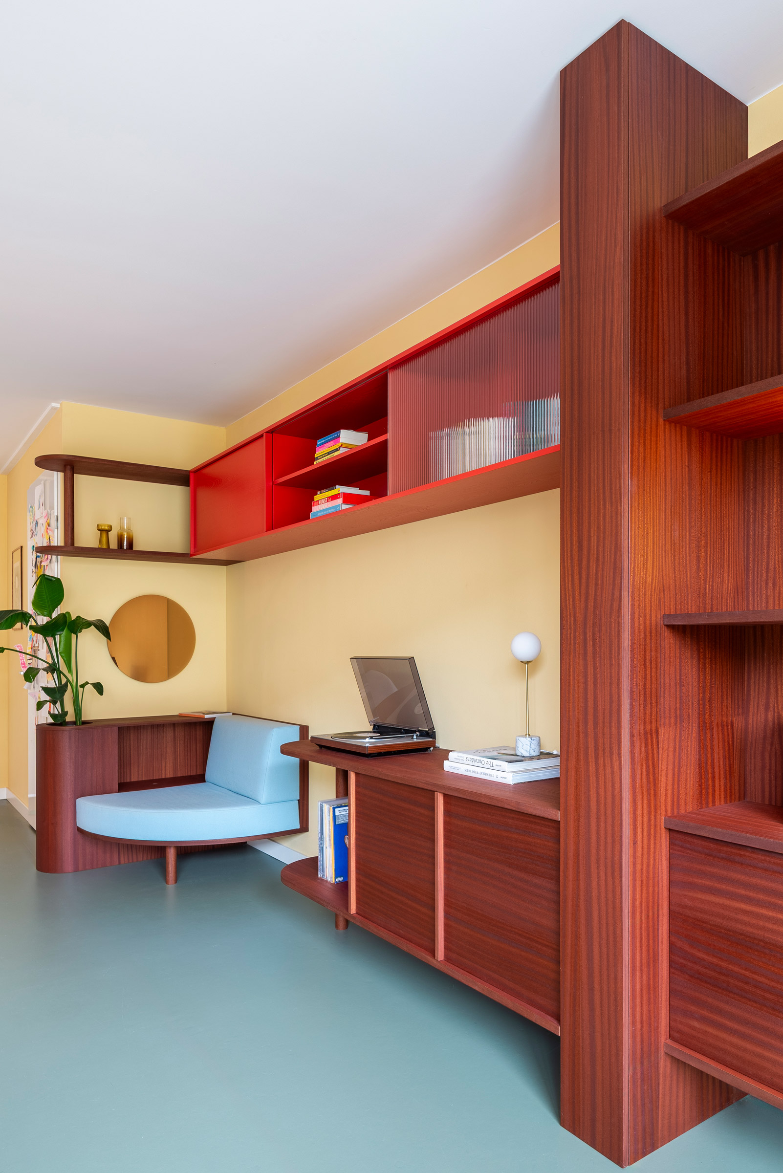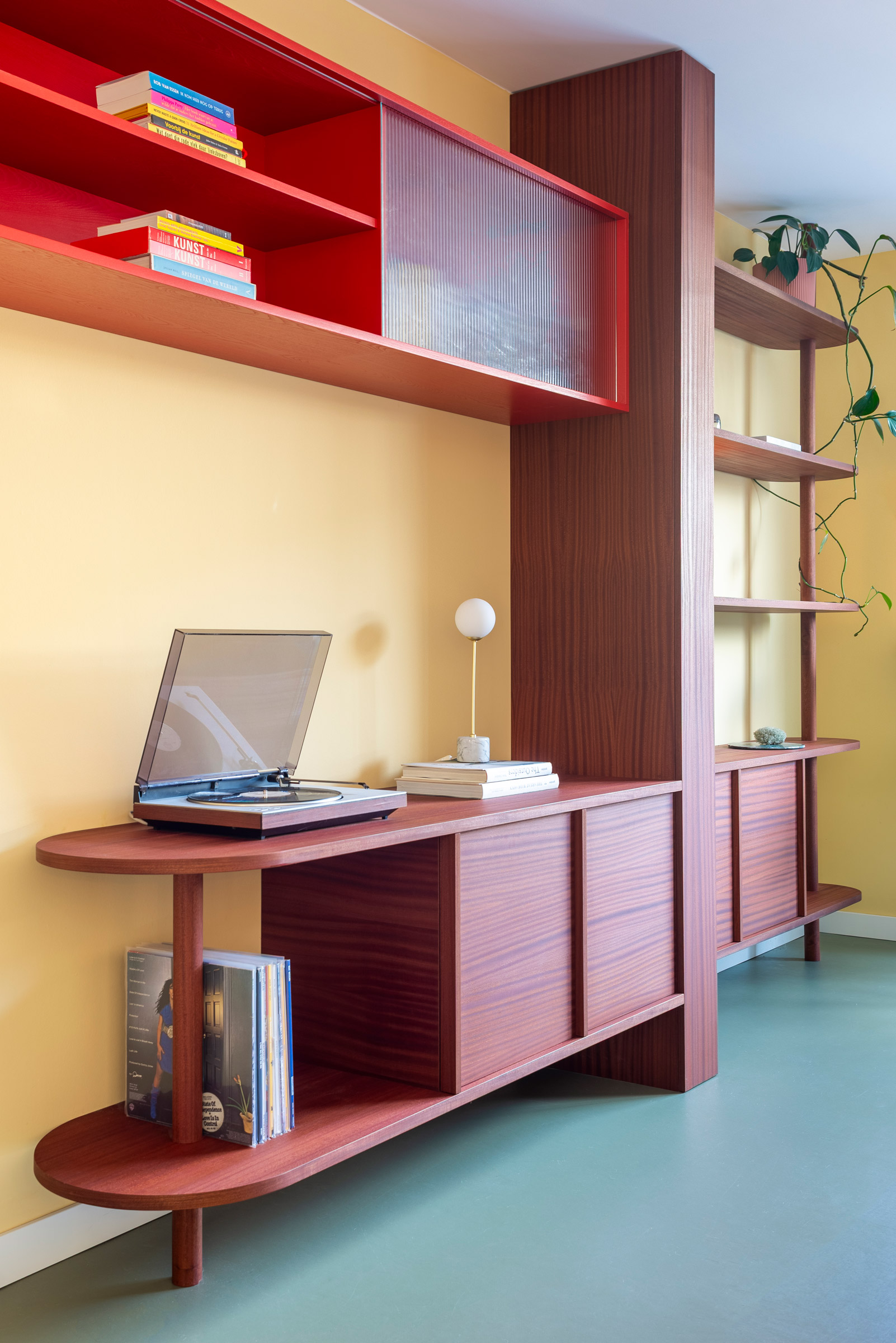 De lange horizontale rode bovenkast maakt een verbinding tussen de mahoniedelen en krijgt nog wat meer karakter en diepte door de schuifdeurtjes van canaleglas.