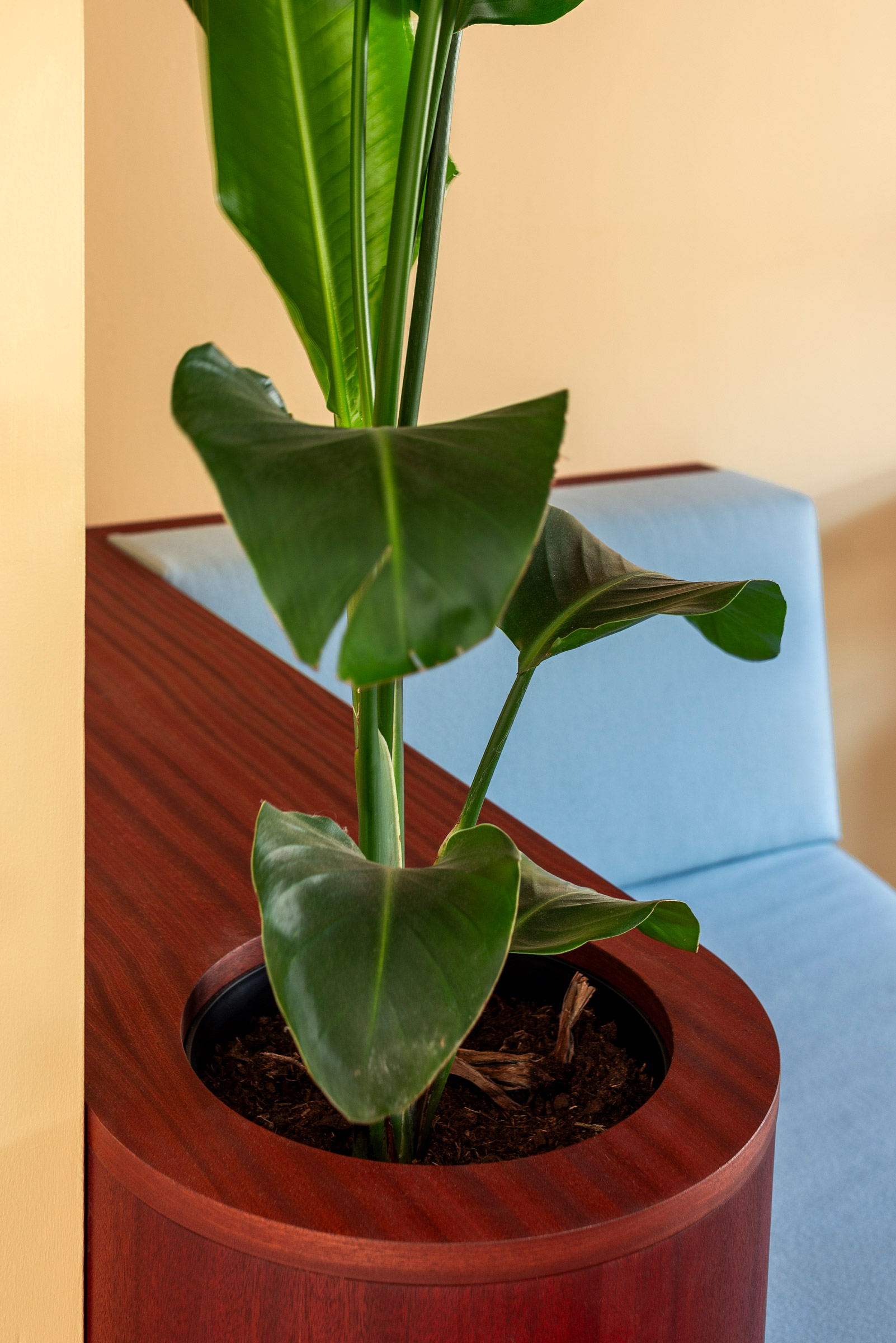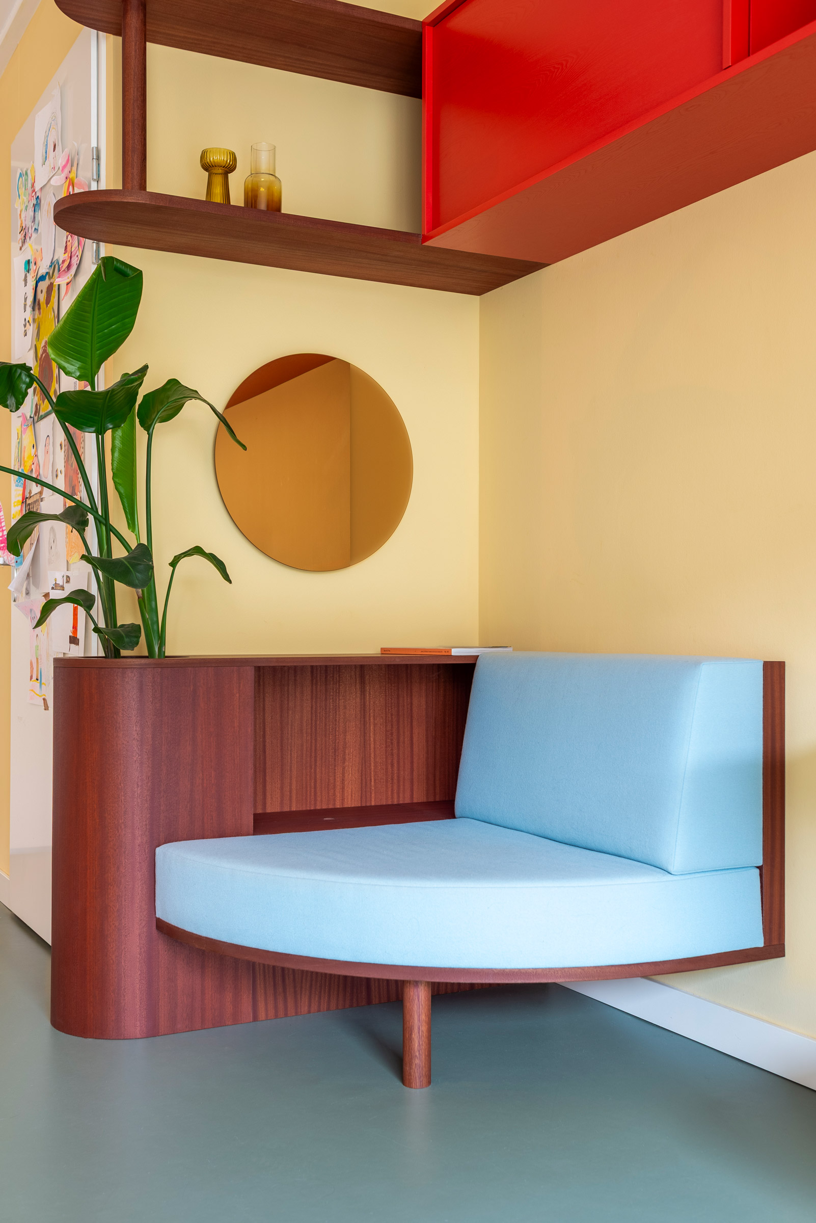 Het zitje wordt inmiddels al veelvuldig gebruikt als koffiehoekje. In het kastje ernaast is nog wat extra opslagruimte onder het luikje. De ronding van de kast wordt geaccentueerd met de mee-ontworpen plantenbak.